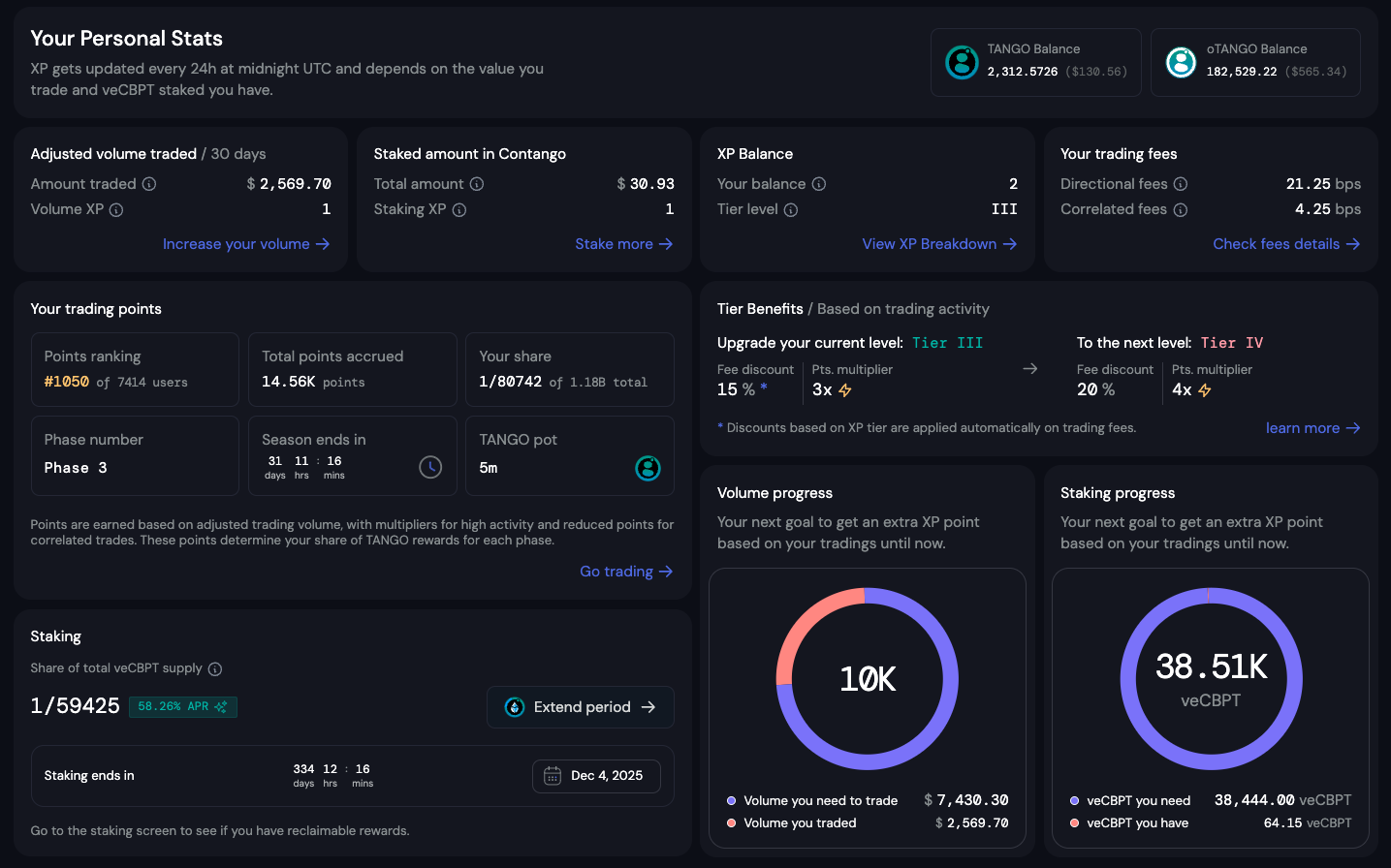 * Your [points](https://docs.contango.xyz/basics/key-features/incentives-and-rewards/contango-points) ranking, which entitle you to a share of the quarterly TANGO pot.