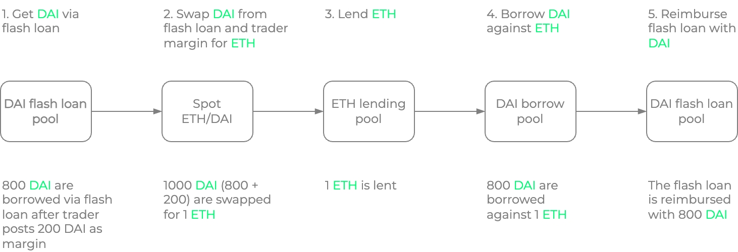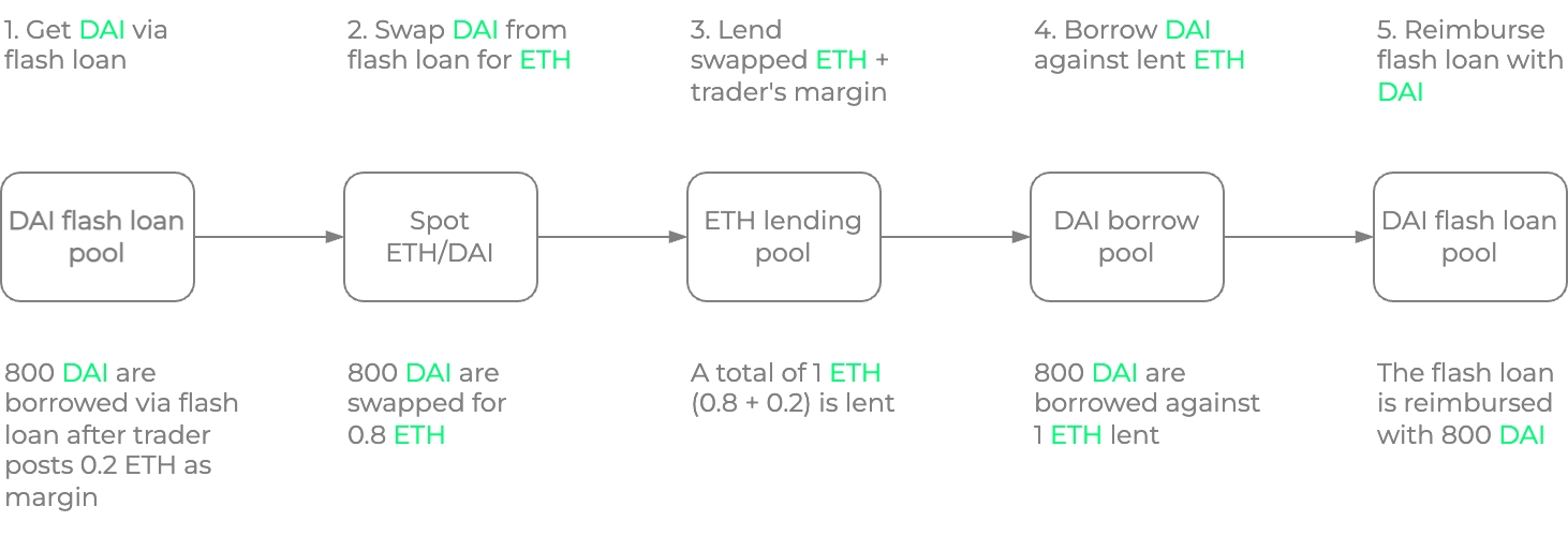 When a trader opens a long ETH/DAI position with DAI as margin, the protocol gets the remaining DAI from a flash loan, swaps all DAI for ETH on the spot market, and lends ETH on a money market, to borrow DAI and repay the flash loan.